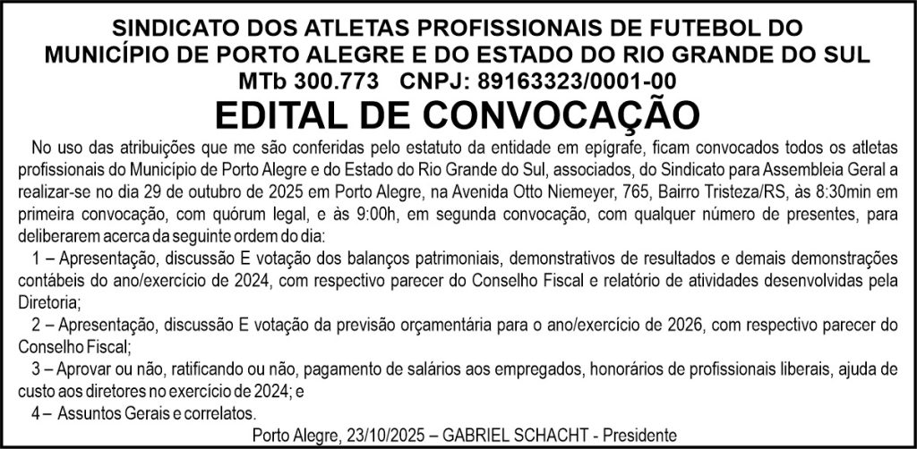 O Presidente do Sindicato dos Atletas Profissionais de Futebol do RS, Gabriel Schacht, convoca para Assembléia Geral a realizar-se no dia 29 de outubro de 2025. Confira abaixo o Edital na íntegra.